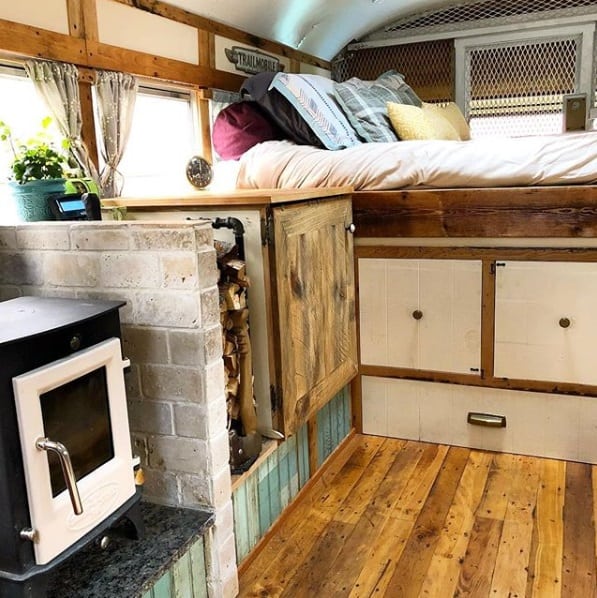 The bus has a beautiful wooden floor, painted pine boarding and a well thought-out dining/kitchen area with hand-built units, oak worktops, a gas cooker and a fridge. At the back is a cosy double bed and a wood-burning stove placed on an old flagstone.