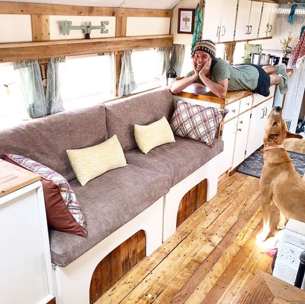 Pete and Taylor from Wisconsin turned their van into a home and now travel around the USA with their dog.